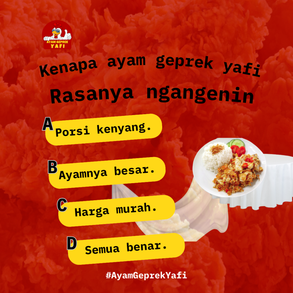 “Ayam Geprek Yafi memang juara! Pedasnya pas, gurihnya bikin nagih!” – Siti, Semarang.